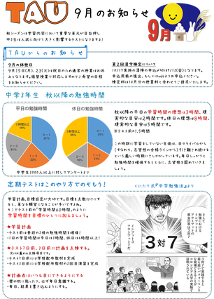 01日 9月 2025 9月号 TAU新聞 秋シーズンは学習内容において重要な単元が目白押し 中3生の定期テストは、入試に向けて大きく影響するテストになりますよ! 2学期始まったと思ったらすぐに中間テストですね! ★9月の予定★ ・9月15日(月)、23(火)は祝日のため通常の授業はお休みとなります。 振替授業で対応しますのでご希望の日程をお知らせください。 ★漢字検定の実施について ・10/19㈰に教室で実施する漢検の申込〆切は9/12(金)となります。 申込用紙の提出、もしくはwebよりお申込ください。 tagPlaceholderカテゴリ: